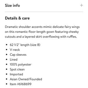 Dramatic shoulder accents mimic delicate fairy wings on this romantic floor-length gown featuring cheeky cutouts and a layered skirt overflowing with ruffles.