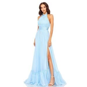 Get a timeless and trendy look in a new couture from Mac Duggal 67816 creations. This flowy prom dress features a high halter neckline, it is an empire waistline and its sleeveless. The top has a ruched design and the skirt has a high slit to show some skin. It is also an open back for alluring look and has a back zipper for closure. You will definitely make a statement in every occasion with Mac Duggal dresses. The model is wearing Sky Blue and Hot Pink color.