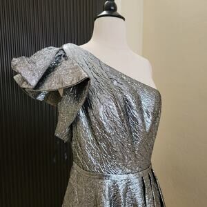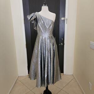 Stunning metallic tea-length dress with dramatic bow one-shoulder detail and functional pockets.