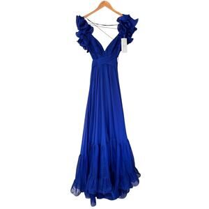 Mac Duggal 67911 Ruffle Tiered Cut Out Chiffon Gown Dress in Cobalt Blue. Size 0. Features: V-neck, short sleeve, pleated bodice, ruffle shoulder details, lace-up back, back zipper closure. Fully lined. Chiffon fabric (100% polyester). NWT / New with tags. Retails $598.