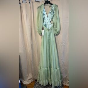 Mac Duggal 67948 NWT Green Pleated Cut Out Long Sleeve Lace Up Tiered Gown