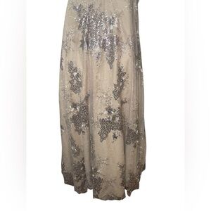 This stunning Mac Duggal Style 67960 evening gown features exquisite sequin embroidery over delicate lace in a soft mocha hue, which appears as a rich cream with silver shimmer. Designed with an elegant one-shoulder neckline and dramatic ruffle detail, the gown is adorned with intricate beaded floral appliqués at the neckline and waist for a flattering silhouette. The A-line skirt offers both elegance and comfort, and best of all—this dress has pockets.