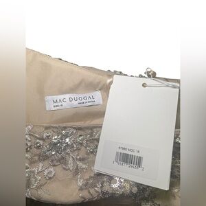 Keywords: Mac Duggal 67960, beaded gown, sequin formal dress, one shoulder lace evening dress, mocha silver ball gown, gala wedding guest dress, plus size formal dress