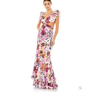 Mac Duggal's floral gown features an O-ring at the waist with cut-out accents, ruffled shoulders, and a ruffled hem.