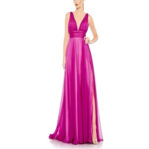 Mac Duggal Style Number 68134 Women's size 10 Formal Evening Gown. Fully lined in a silky feeling lighter pink. Outer chiffon is fuchia pink chiffon with a pretty flow. Has a back zipper.