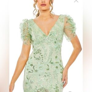 Mac Duggal 68266 mint tea-length formal dress features a slim silhouette in beaded lace embroidery, with a V-neckline and illusion puff sleeves. The sheer lower skirt adds flair to this pretty cocktail dress