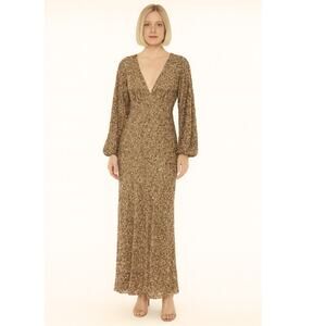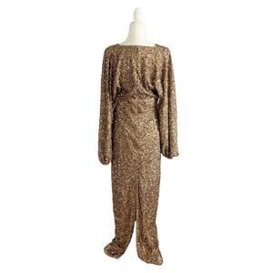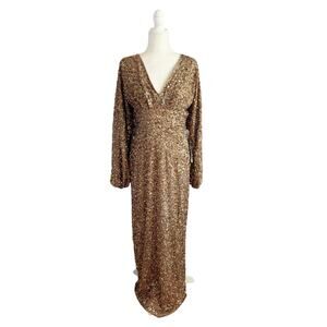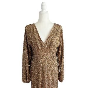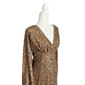 Command attention in this stunning Mac Duggal sequin gown, featuring a figure-flattering silhouette and shimmering bronze finish. The gown’s plunging V-neckline, ruched empire bodice, and elegant bishop sleeves combine to create a sophisticated yet dramatic evening look. With its sleek floor-length skirt and back slit, this gown offers both glamour and movement — perfect for making a grand entrance.