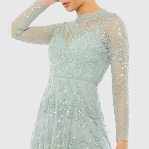 Mac Duggal sequined illusion high ruffle neck long sleeve midi dress. Intricate pattern of color-on-color handworked sequins decorate this dress.