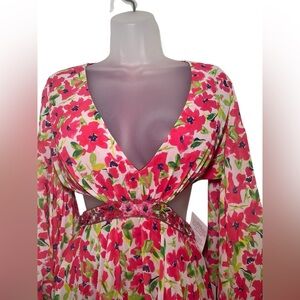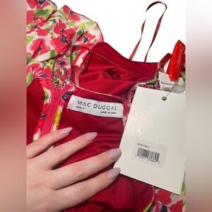 Mac Duggal dress size 4, floral mini dress, cutout summer dress, bell sleeve chiffon dress, Mac Duggal 9158, deep v-neck dress, ruffle hem mini dress, designer cocktail dress, party dress, wedding guest dress