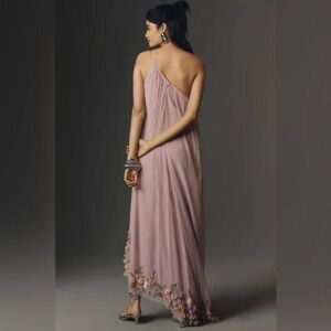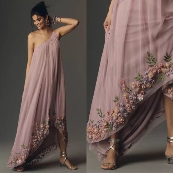 This gown features an asymmetrical silhouette adorned with intricate floral embellishments, radiating elegance and opulence. Perfect for red carpet moments or gala affairs, this gown guarantees you'll make a memorable statement.