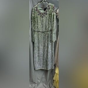 The sensational dress is cut in a modest midi sheath completely covered in sequins that add texture and shine. Bloom-arranged jewels glitter at the collar, shoulders, and waist in a belt-like accent.