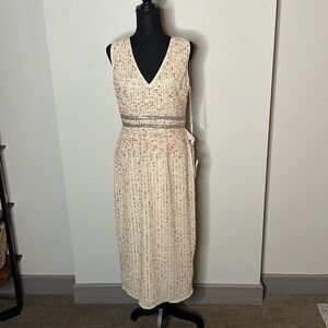 BRAND NEW WITH TAGS Mac Duggal Sleeveless v-neck midi dress embellished with vertically-striped sequins and a hand-beaded belt. Midi-length skirt features a center vent slit.