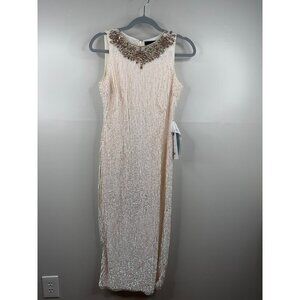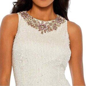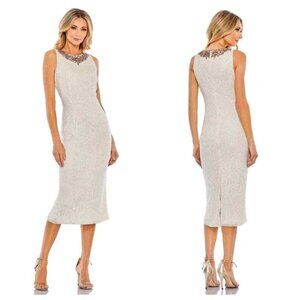 Mac Duggal Fully sequins Midi Sheath Dress Jeweled Collar Tea Length