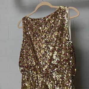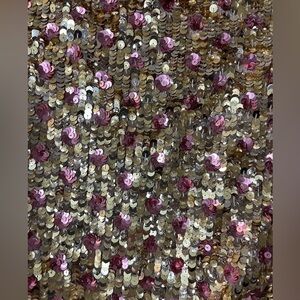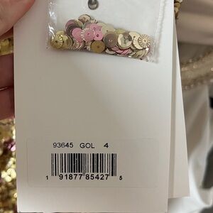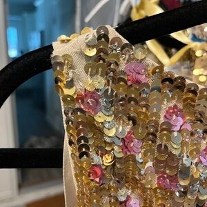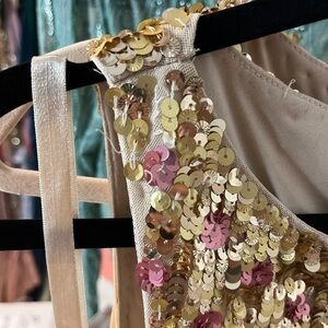 See two photos with few missing sequins on shoulder strap extra sequins attached to tag