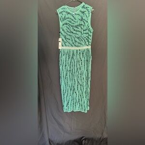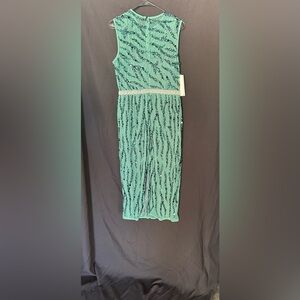This dress is crafted from sequin-embellished mesh fabric, and features an illusion high neckline. The partially lined bodice and fully lined skirt offer comfort, while the beaded waist detail adds a touch of sparkle. Make a statement with this glamorous dress!