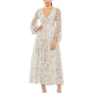 Mac Duggal 93788 Size 8 Long Sleeve V-Neck Pink Green White Floral Midi Dress
