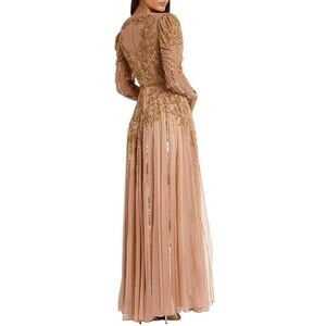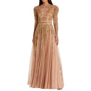 Mac Duggal $998 Gown Dress 14 Nude Gold Illusion Beaded Embellished Puff Sleeves