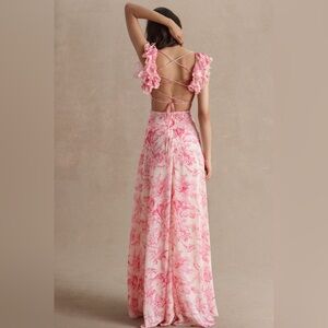 Mac Duggal Anthropologie Floral Printed Ruffle Shoulder Lace Up Gown size 2.