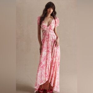 Step out in style with this elegant pink floral maxi dress. Perfect for any occasion, this dress features a flattering silhouette and delicate floral patterns. Ideal for adding a touch of femininity to your wardrobe.