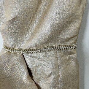 Dramatic ruffle detailing adds elegance to this metallic ballgown, designed with a beaded band to define the waist.