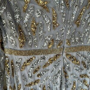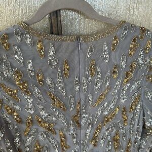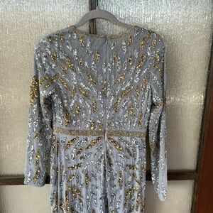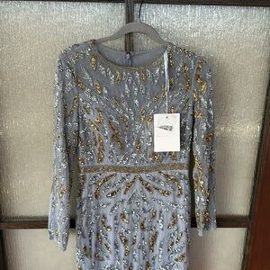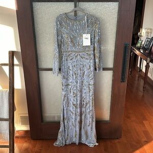 Mac Duggal BEADED LONG SLEEVE EVENING GOWN size 8 in platinum gold NEW $598