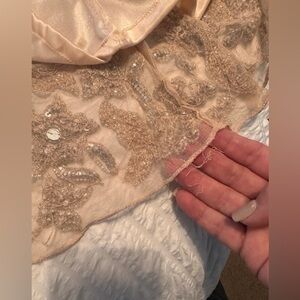 Size: 12 - professionally altered length of dress and seamstress added tie up bows on bottom inside hem to keep small train up. A few snags on bottom inside, not visible when wearing. See pictures condition - Worn once!