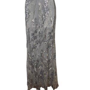 Keywords: Mac Duggal, beaded gown, embroidered dress, formal evening dress, flutter sleeves, fit and flare, gown with belt, silver dress, NWT dress, gala dress, wedding guest dress, prom, platinum evening gown.