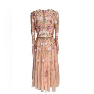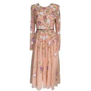 This dress is a stunning choice for any special occasion. Adorned with shimmering sequined floral patterns, this dress captures the light beautifully. The high neckline and long sleeves provide a refined look, while the midi length offers a classic silhouette.