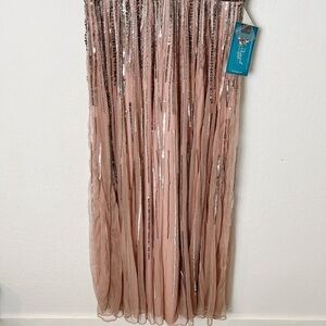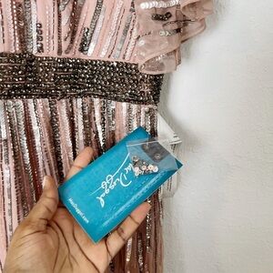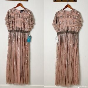 Mixed beading and sequins cover this lightweight flutter-sleeve gown.