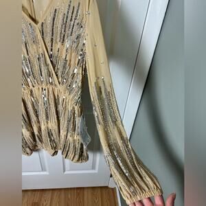 Chic surplice long-sleeved romper with vertical sequin embellishment.