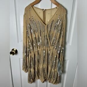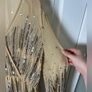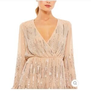 Mac Duggal Beaded Sequin Long Sleeve V Neck Surplice Neck Romper 10563 Nude 10