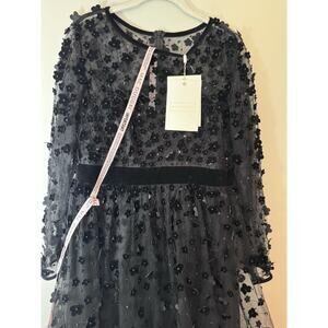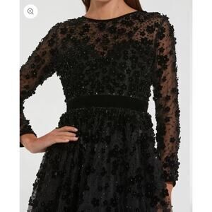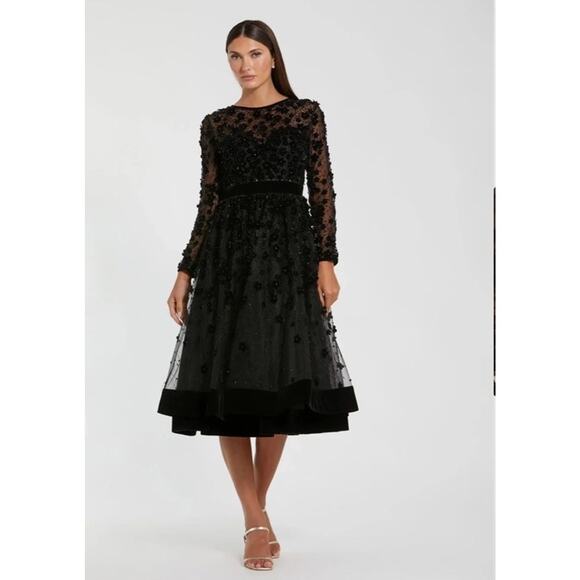 Mac Duggal Black Embellished Illusion High Neck Long Sleeve Fit Flare Midi Dress