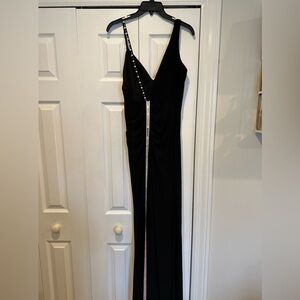 Chic asymmetrical strap gown featuring a v-neckline, a ruched waist, sexy lowcut back, and a floor-length skirt with a sweeping train and thigh-high slit. Left-side spaghetti strap is embellished with an elegant pearl trim.