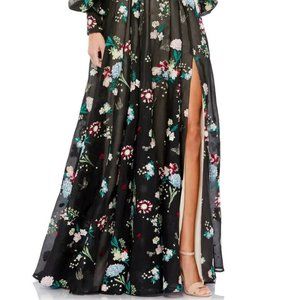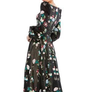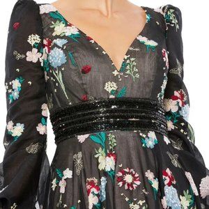 Mac Duggal Black Floral Embroidered Beaded Waist Long Sleeve Gown