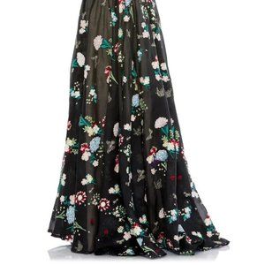 Colorful blooms crafted from exquisitely placed embroidery blossom over this breathtaking gown fashioned with a jewel-embellished waist and stem-baring slit.