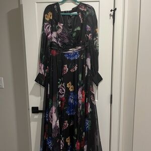 Mac Duggal Black Floral Print Chiffon Long Sleeve Maxi Dress