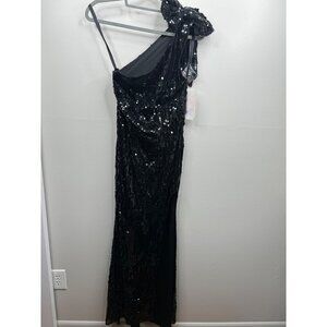 Mac Duggal Black Fully Sequined One Shoulder Bow Evening Gown Formal