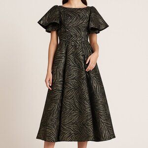 New with tags Mac Duggal black and gold brocade gown, Style 21063. This stunning dress features a metallic zebra-textured pattern, flutter sleeves, and a structured A-line silhouette that offers elegant movement. Designed with a high boat neckline and fitted bodice, it’s perfect for formal events, holiday parties, or black-tie occasions.