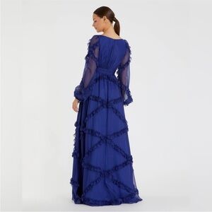 Mac Duggal Blue Cascade Ruffle Puff Sleeve A Line Gown