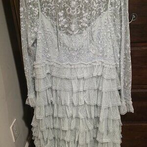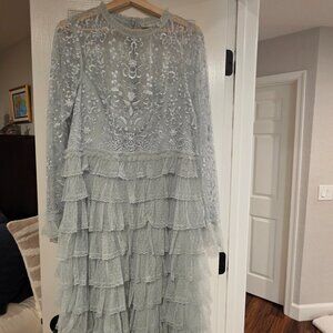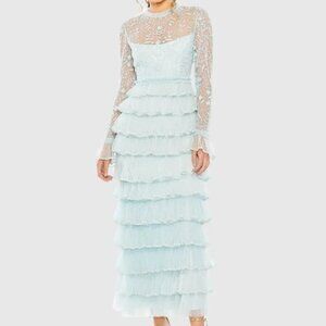Mac Duggal Blue Embroidered Long Sleeve Ruffled Tiered Dress