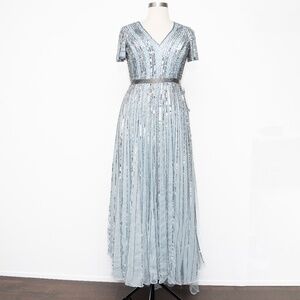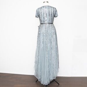Mac Duggal striped sequin gown featuring allover gunmetal beading for a striking, sophisticated look. Designed with a deep V-neckline and short flutter sleeves that add a touch of softness and movement. The hand-beaded belt defines the waist, while the floor-length silhouette creates an elegant profile. Fully lined for comfort, with a concealed back zipper for a smooth fit. Crafted from 100% polyester sequin fabric, perfect for formal events or any occasion where you want to stand out.