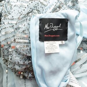 Mac Duggal. Blue Stripe Sequin V-Neck Gown.