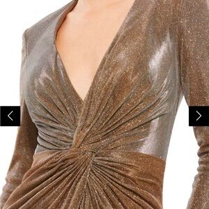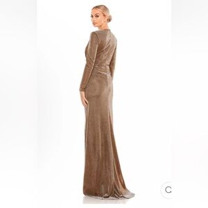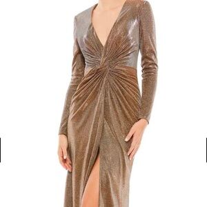 Elegant bronze maxi dress. Features a deep V-neck and long sleeves. High slit for added style.