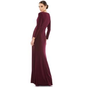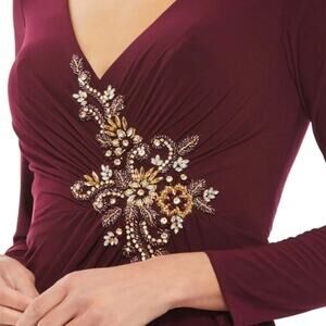 Elegant burgundy midi dress. Features intricate gold embellishments. Long sleeves and V-neckline. Perfect for formal occasions.