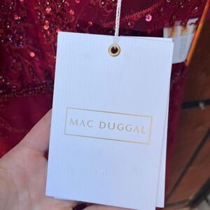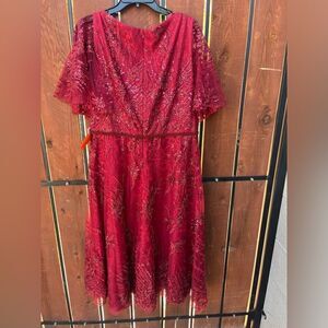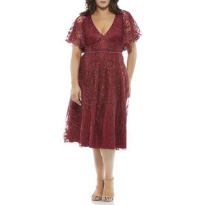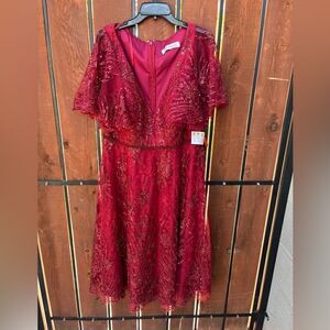 Mac Duggal Burgundy Flutter Sleeve Beaded A Line Midi Dress NWT Size 14W
