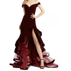 Elegant strapless gown with ruffled skirt. Deep burgundy color. Perfect for formal events.