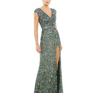 Mac Duggal Cap Sleeve Sequined High Slit Gown (Forest Green, Size 6)
