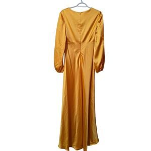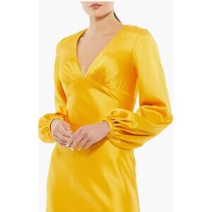 Indulge in timeless sophistication with this gorgeous charmeuse gown. It features a flattering V-neckline and elegant long blouson sleeves, perfect for making a statement at any special occasion. This gown combines classic design with luxurious comfort, ensuring you look and feel radiant.