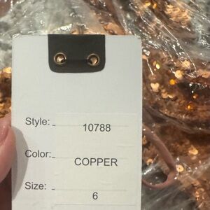 Stunning copper sequin dress. Ideal for glamorous events. NWT size 6 Please note due to the intricate nature of the gown, it's possible there could be a slight flaw (loose string, missing bead or sequin, etc.)