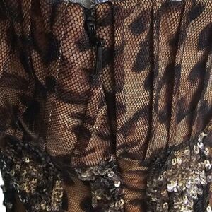 Mac Duggal leopard lined cocktail dress with mesh and sequin striped overlay, side zipper and double straps. Includes bust padding (not removable).